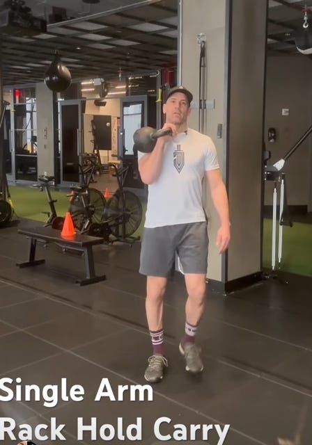 We then move to some holds. A hold is just what it says, holding a heavy object usually while walking or marching, or even standing. These can be either a farmer carry (at your side hips), rack hold carry (at the shoulders), or overhead carry. This is good for grip strength and they are also basically a moving plank. I’m getting trunk and core stability as well as muscle mass building. We do them for about two minutes for each hold so that’s a lot of time under tension with literally zero risk of injury. I’ll go through other benefits.